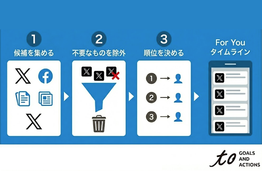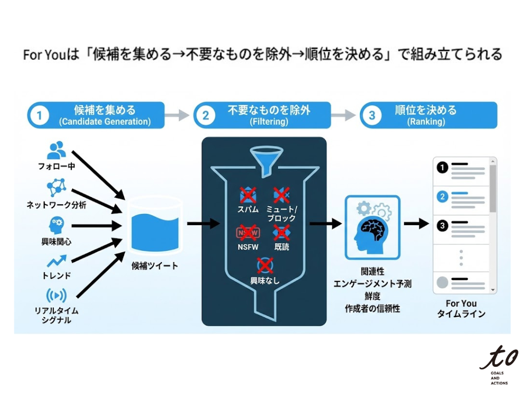 この記事では、For You(X内での「おすすめ」)が どういう流れで作られているか を